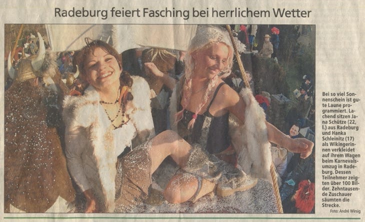 Unser Nachbarort ist sächsische Karnevalshochburg. Seit 1957 wird in Radeburg „Volkskarneval“ zelebriert. Das bedeutet, hier wird alles von den Bürgern auf die Beine gestellt und nicht von bezahlten Profis. Der Radeburger Carnevals Club organisiert alljährlich geniale Partys, angefangen bei den Prunksitzungen über Schlafmützenbälle, Tirolerball und Rockfasching gipfelt die Saison seit vielen Jahren in 2 Megapartys auf dem überdachtem Marktplatz. Am Faschingssonntag ist dann der Umzug bestehend aus, natürlich, dem RCC, vielen anderen Faschingsvereinen und sehr vielen privaten Gruppen die immer wieder, passend zum Saisonmotto, herrliche Umzugswagen oder Laufbilder in RaBu zeigen.