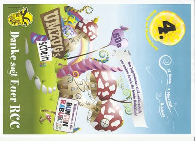 Dann ist uns die Puste ein wenig ausgegangen und wir sind mit Grimm’s Märchen auf die 18 abgefallen. 2012 strandete unsere Weltumseglung bei einer Anerkennung. Zur 56. Saison waren wir als Geisterjäger zurück in der Wertung. Die „Bunte RaBuBlik“ haben wir als Legomännel verschönert und konnten uns über den 4. Platz freuen. 2015 starteten wir mit „RaBu Airlines“ vom „Heinrich - Zille - Airport“ und landeten auf Platz 16. Zur „Olympiade der Plagiate“ 2016 haben wir Zille unterstellt, der Urheber allerlei bekannter, historischer Kunst zu sein. Dafür hat uns die Jury den 12. Platz quittiert.